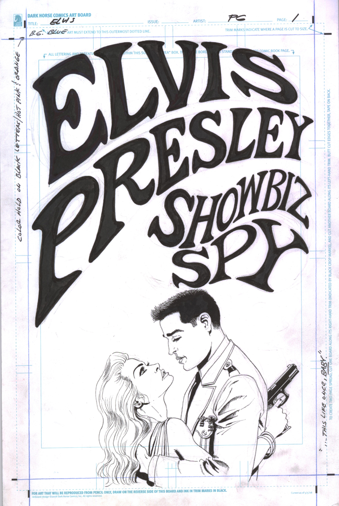 Here's a little F.Y.I for inquiring minds who need to know or maybe don't give a blank. Anyhoo, when Jimmy Palmiotti were hired by Liquid Comics to do a graphic Elvis chapter we inadvertently were not told what the exact dimensions of the page size would be. We assumed they would be the standard 11/17 comic dimension. Not so, dear friends. As a result, all pages had to be cropped. Here is what the pages looked like originally raw and naked.